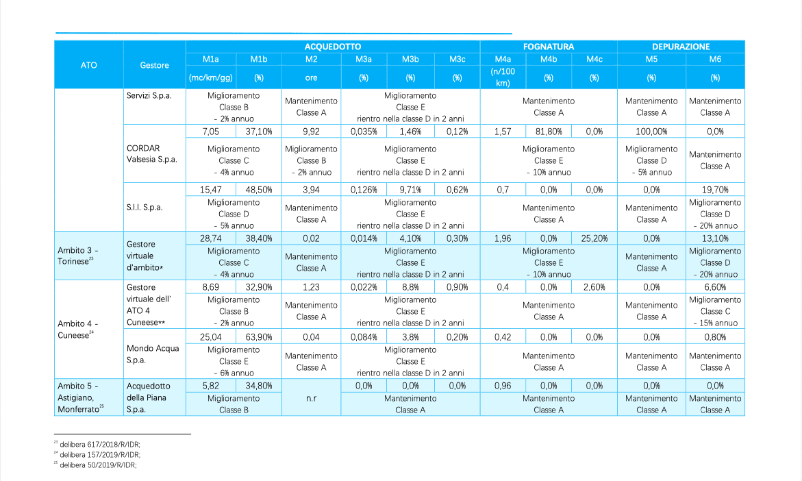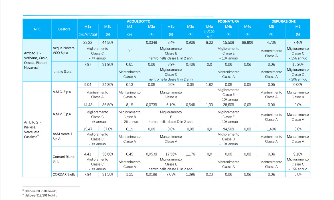 M1a – Perdite idriche lineari; M1b – Perdite idriche percentuali; M2 – Interruzioni di servizio; M3a – Incidenza delle ordinanze di non potabilità; M3b – Tasso campioni non conformi; M3c –Tasso di paramenti non conformi; M4a – Frequenza allagamenti; M5 – Smaltimento fanghi in discarica; M6 – Tasso di superamento dei limiti nei campioni di acqua reflua scaricata