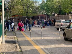 Ben coperti perché il vento di ieri ha abbassato e non poco le temperature, vicino a mamma o papà, per i più piccoli, in attesa dell’apertura del cancello. Dopo tre settimane abbondanti è suonata di nuovo oggi, mercoledì 7 aprile, la campanella per gli alunni della scuola materna, primaria e