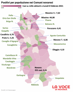 Nel Nord della Provincia vi sono invece diversi comuni che presentano un numero di casi anche allarmante: a Miasino, che aveva un solo caso a Natale, gli attuali 35 casi significano il contagio del 4,4% della popolazione, un valore da record anche rispetto a quelli più alti del picco della seconda ondata a novembre. Dati elevati di casi positivi su popolazione si rilevano anche a Massino Visconti (7,62, era “Covid free” a metà gennaio), Cavallirio (6,70), Paruzzaro (6,41) e Prato Sesia (5,35).