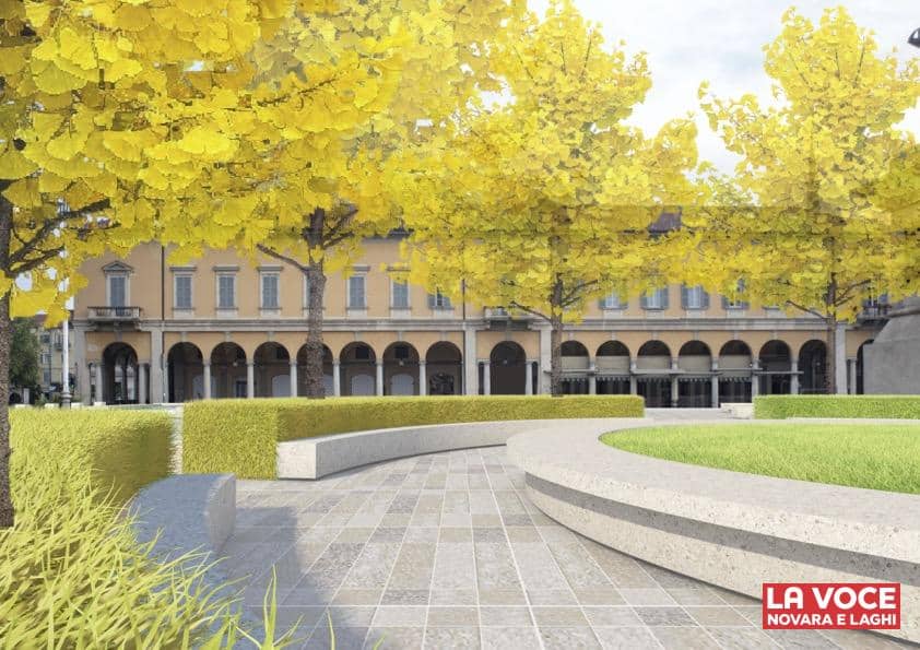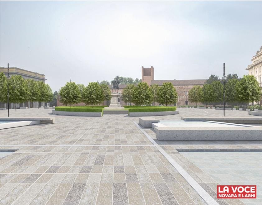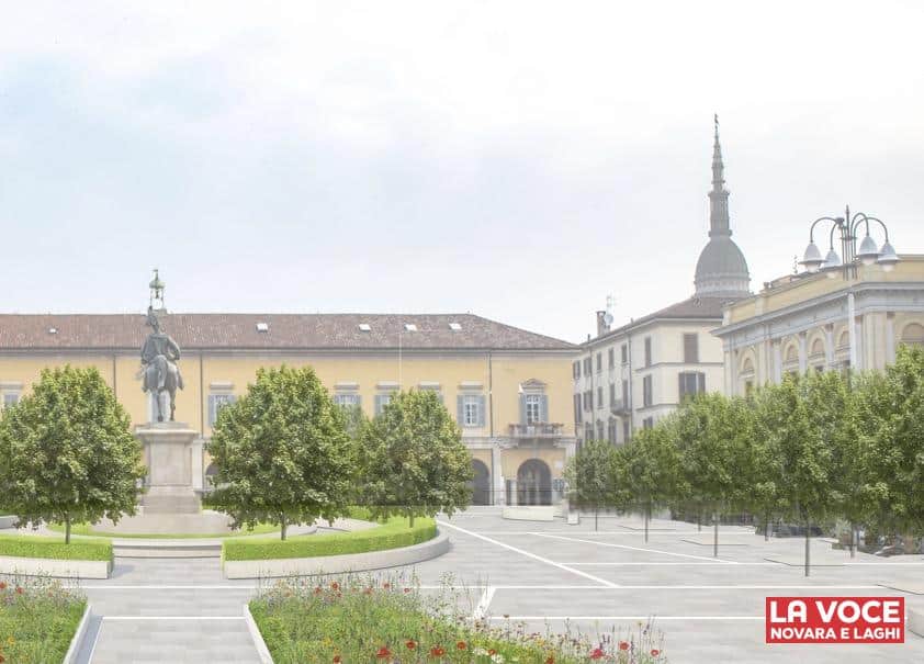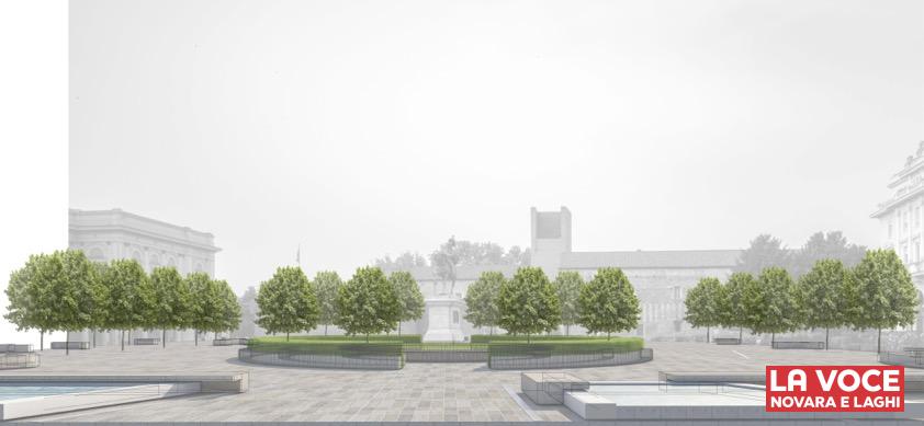 La nuova piazza sarà pavimentata ex novo con materiali di pregio, come la pietra di Luserna e il granito di Montorfano. Gli alberi, ginkgo biloba e aceri, saranno disposti in doppio filare lungo il Teatro Coccia, formando due semicerchi che abbracciano e valorizzano il monumento a Vittorio Emanuele II. Sul lato opposto, un filare unico separerà la piazza dalla viabilità, che resterà aperta. Le vasche d’acqua e le fontane a raso richiameranno simbolicamente il tema delle risaie e del legame con il territorio.