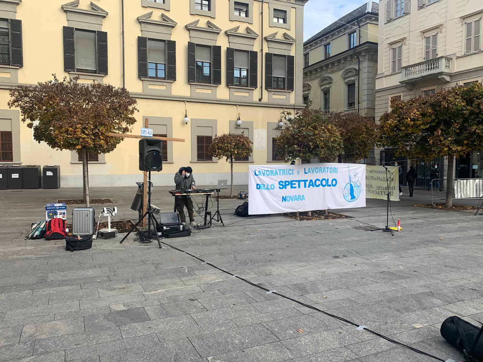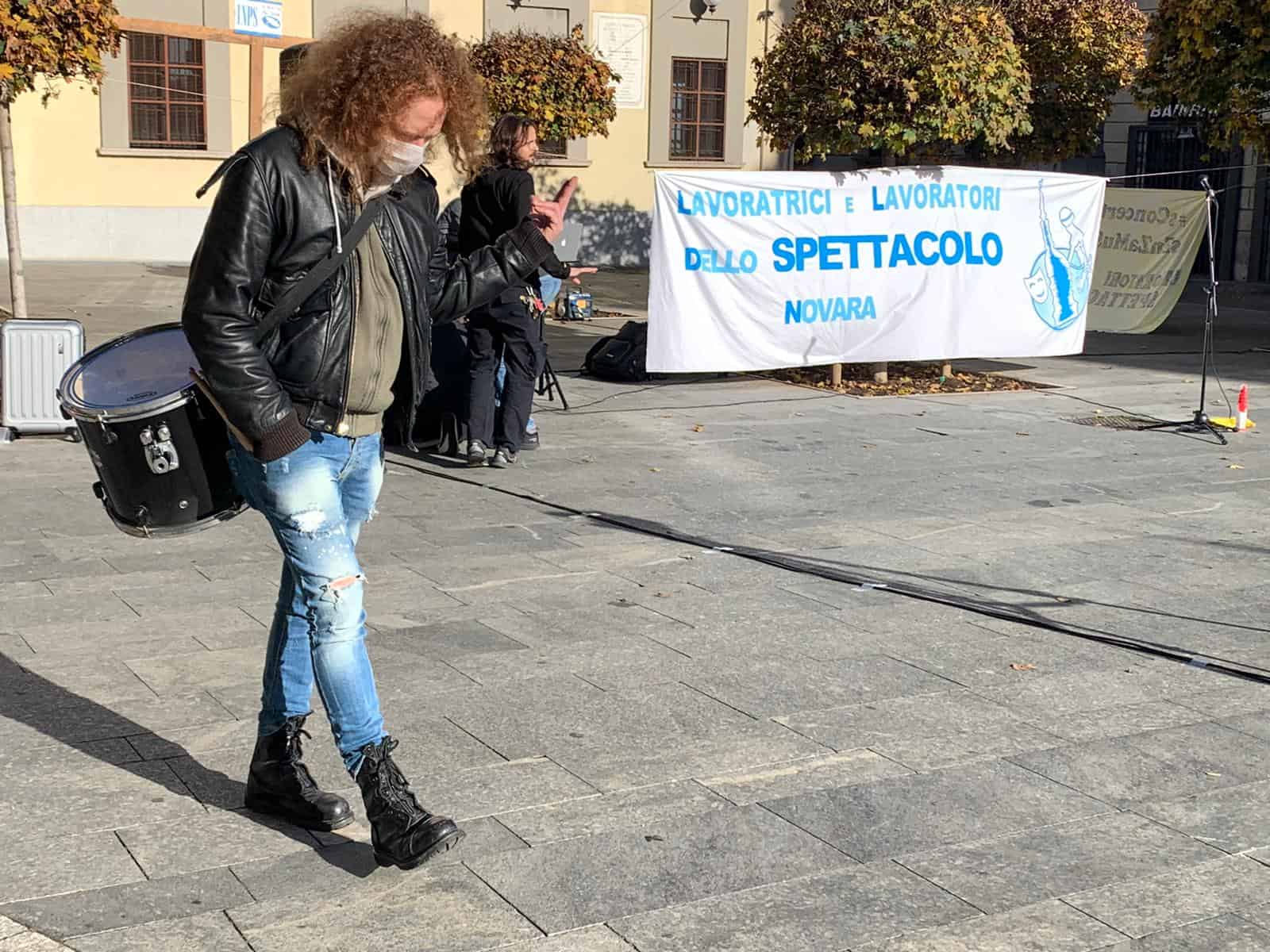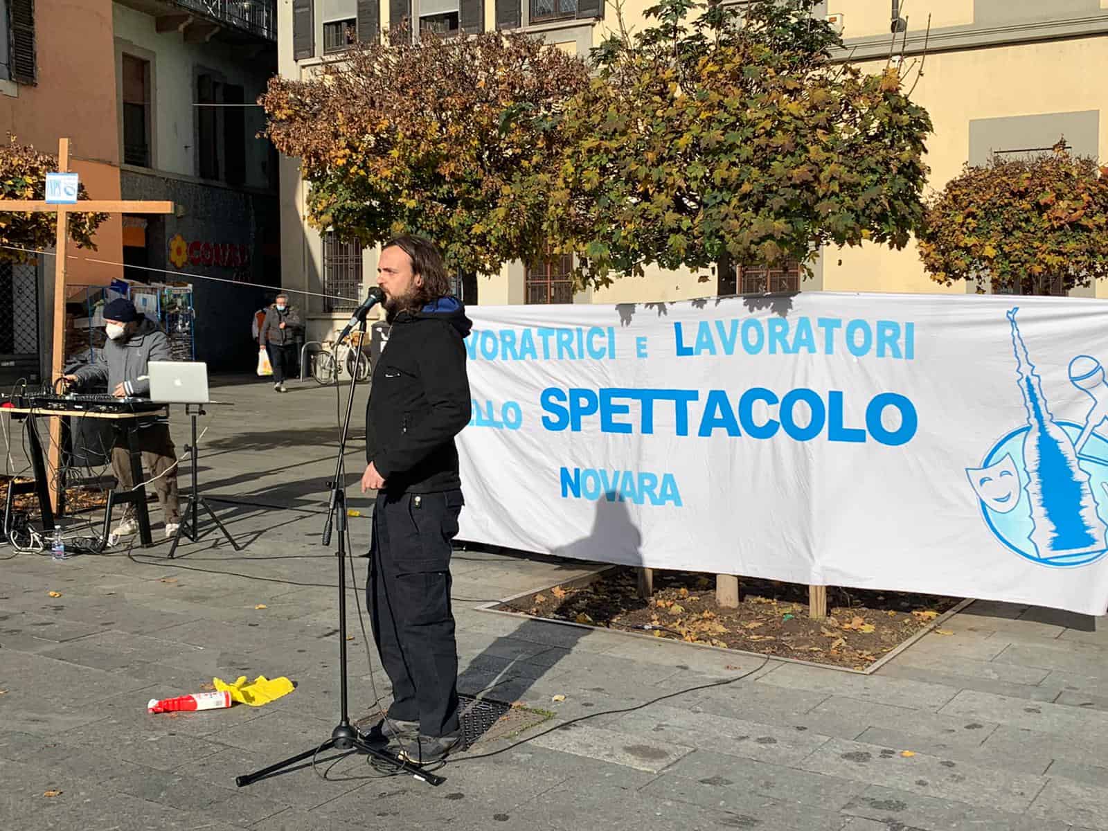 «Spettacolo e Cultura: siamo il settore più in crisi. Abbiamo bisogno di norme. Siamo il settore preso meno in considerazione. Il Covid è stata la goccia che ha fatto traboccare il vaso». Ha speso queste parole, anche se davanti a una platea molto molto ridotta, Walter Pilaf Roncaglia, referente del movimento di maestranze del mondo dello spettacolo novarese “Lavoratrici e lavoratori dello spettacolo Novara”, in piazza Gramsci a Novara: oggi, venerdì 20 novembre, si è tenuta la prima manifestazione pacifica. Il movimento è composto principalmente da tecnici e musicisti che appoggia il movimento regionale “Lavoratrici e Lavoratori dello Spettacolo Piemonte” e nazionale “Professionisti Spettacolo e Cultura – Emergenza Continua”.