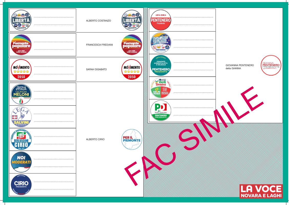 Con le Regionali si eleggono il Presidente e 50 membri del Consiglio regionale del Piemonte. L’elezione avviene con un sistema misto, sia proporzionale che maggioritario, per la prima volta secondo la nuova legge elettorale approvata nel luglio dello scorso anno. Secondo il sistema maggioritario si elegge il Presidente (vince chi prende più voti) che porta con sé 10 consiglieri della lista regionale a lui abbinata (il “listino”), mentre con il sistema proporzionale si eleggono gli altri 40 consiglieri attraverso le liste circoscrizionali e la loro attribuzione è condizionata da soglie di sbarramento (escluse coalizioni sotto il 5% e liste singole sotto il 3%). Ogni provincia è una circoscrizione con un numero assegnato di seggi (Novara ne ha 3). Per l’assegnazione dei seggi in Consiglio vige il premio di maggioranza che prevede da 28 a 32 consiglieri attribuiti alla coalizione vincente (compresi quelli del “listino”) a seconda della percentuale raggiunta (da meno del 45% a più del 60%).