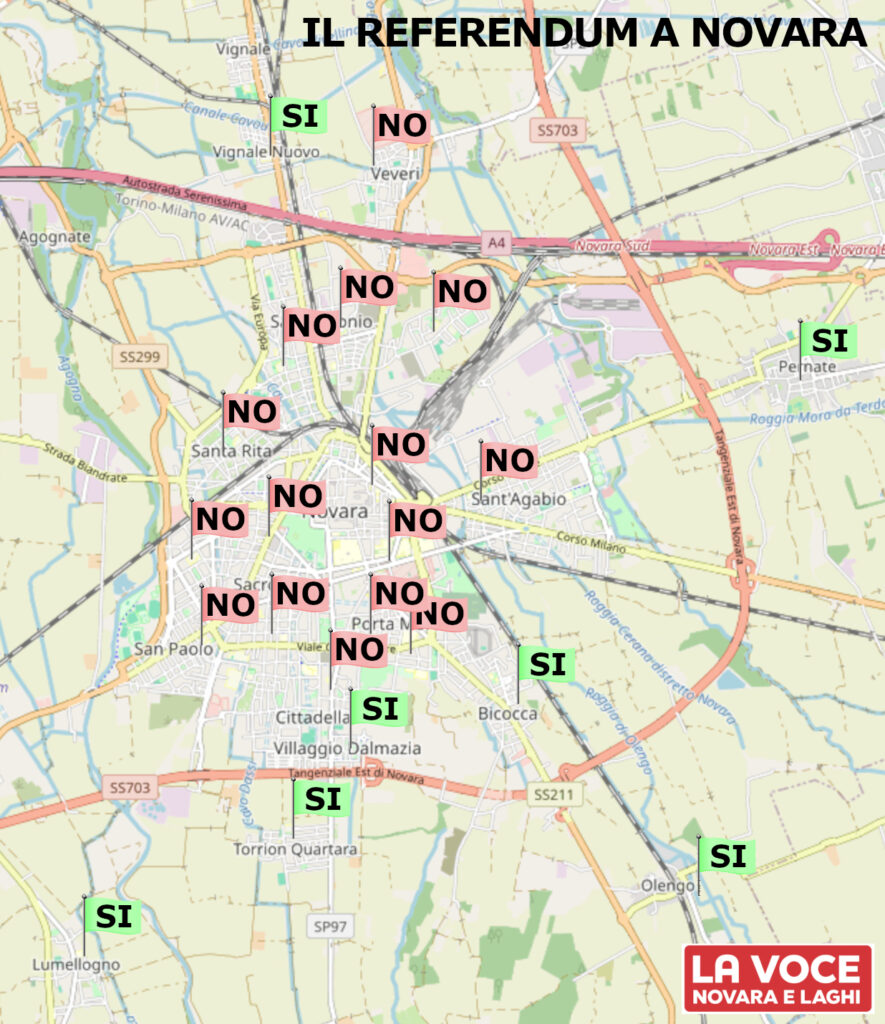Così, se il NO a Novara ha toccato il 51,66% il valore massimo (56,7%) si è raggiunto ai seggi della De Amicis di via Monte San Gabriele (zona Porta Mortara), seguita dal 55% alla Buscaglia di via Chinotto (Sant’Antonio) e dal 54,49% alla Papa Giovanni XXIII di via Roggia Ceresa (Santa Rita). Il massimo risultato del SI è invece ad Olengo (56,47%), seguito dal Villaggio Dalmazia (55,31%) e da Lumellogno (54,58%).