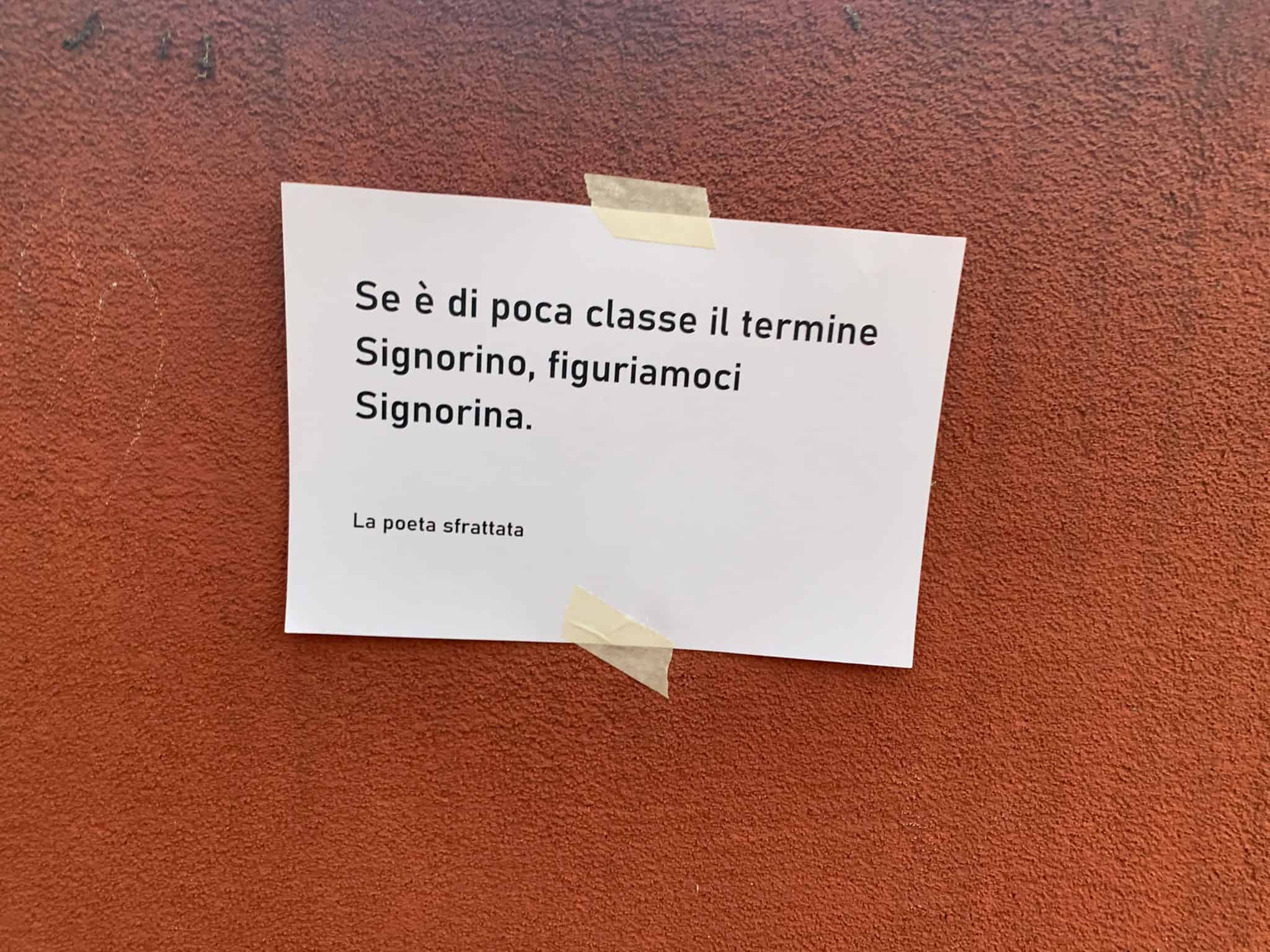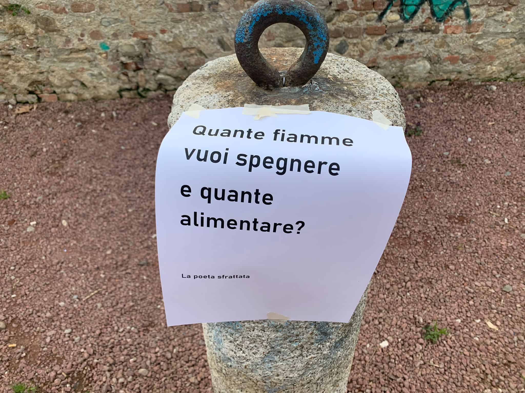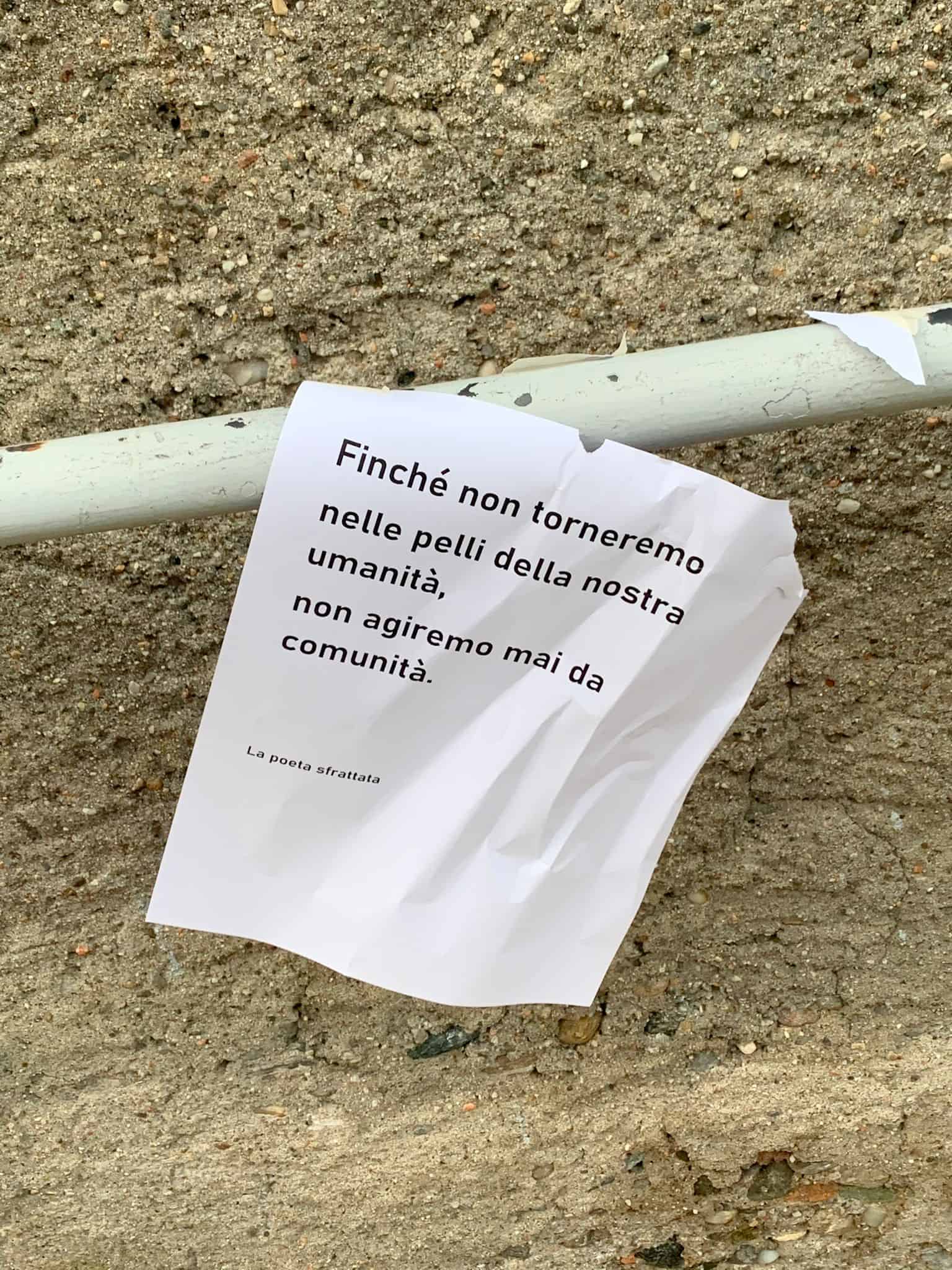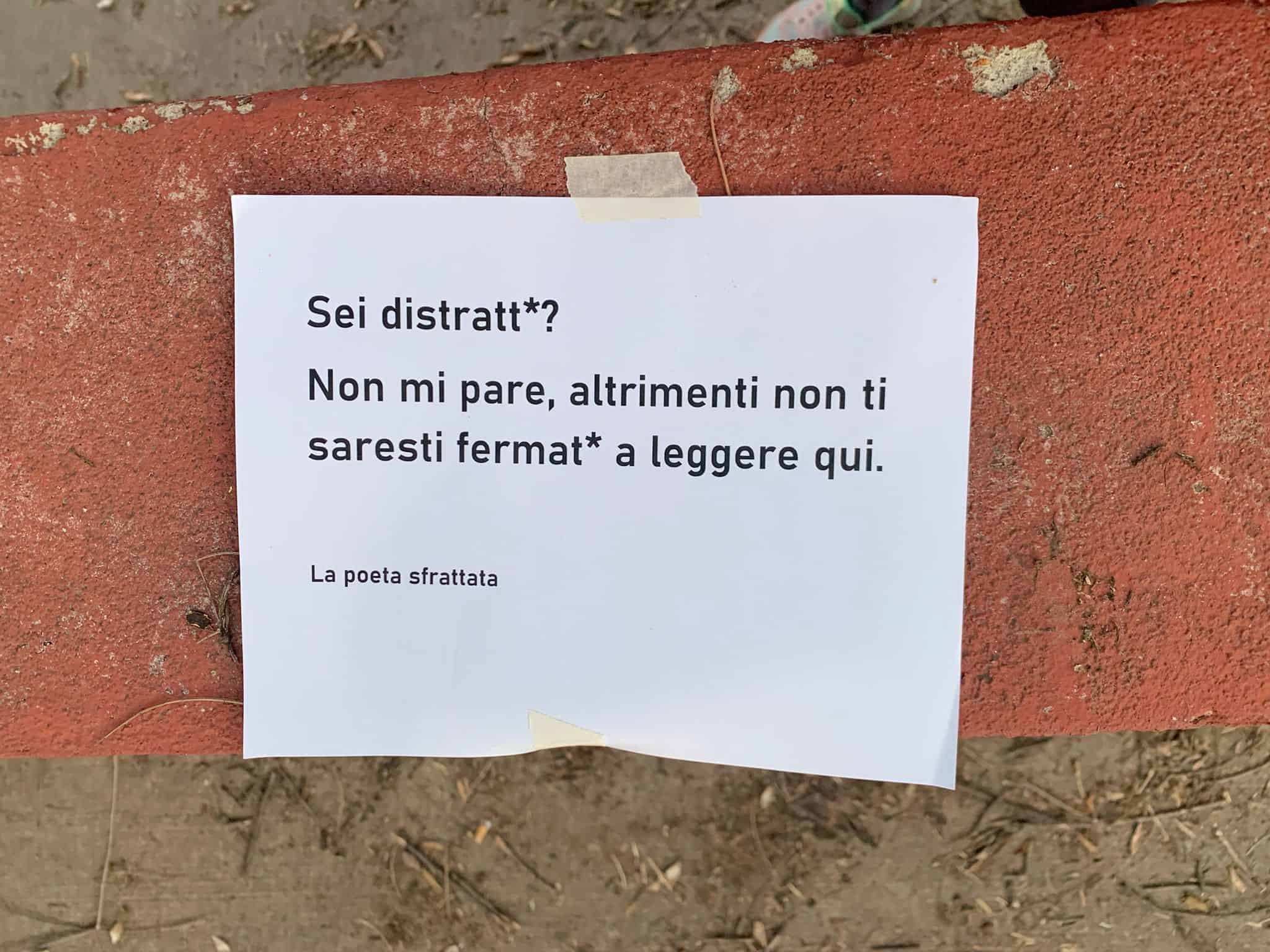 «Sei distratt**? Non mi pare, altrimenti non ti saresti fermat* a leggere qui». E’ solo una delle tante frasi che “La poeta sfrattata”, come si è firmata su fogli di fotocopia, ha affisso per le vie del centro di Oleggio. I fogli sono sparsi un po’ ovunque, soprattuto in zona campo di atletica e lunga la salita di sassi che porta al centro.