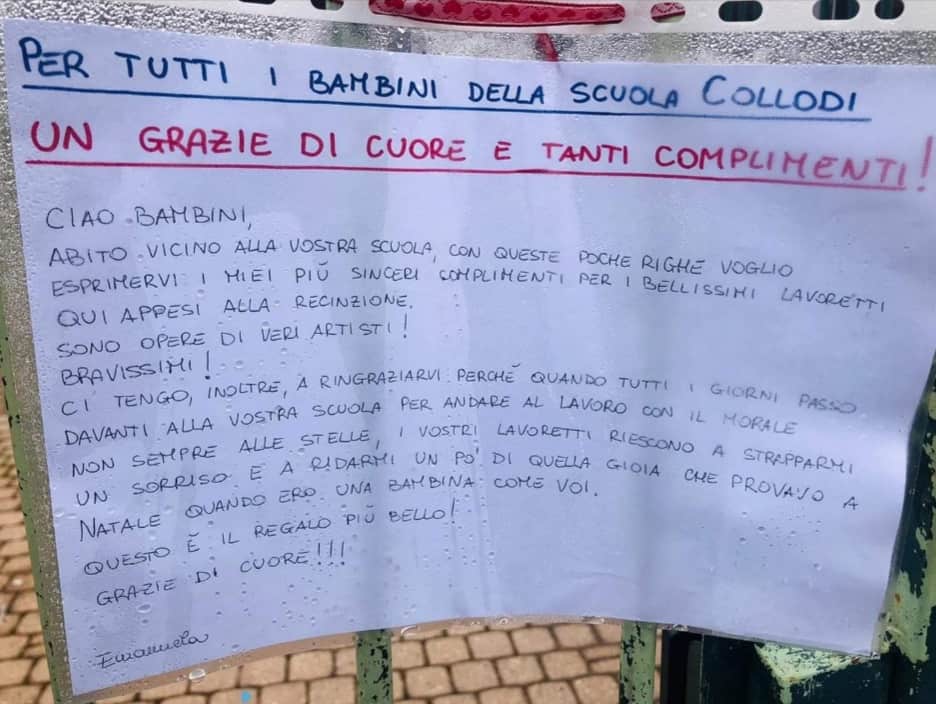 I lavoretti danno il buonumore non solo agli alunni che ogni giorno vanno a scuola, ma anche a tutti coloro che transitano nei pressi delle due strutture. E alla Collodi c’è chi ha lasciato un biglietto per dire Grazie: «Ciao bambini, abito vicino alla vostra scuola, con queste poche righe voglio esprimervi i miei più sinceri complimenti, per i bellissimi lavoretti qui appesi alla recinzione. Sono opere di veri artisti, bravissimi! Ci tengo inoltre a ringraziarvi perché quando tutti i giorni passo davanti alla vostra scuola per andare al lavoro con il morale non sempre alle stelle, i vostri lavoretti riescono a strapparmi un sorriso e a ridarmi un po’ di quella gioia che provavo a Natale quando ero una bambina come voi. Questo è il regalo più bello. Grazie di cuore!».