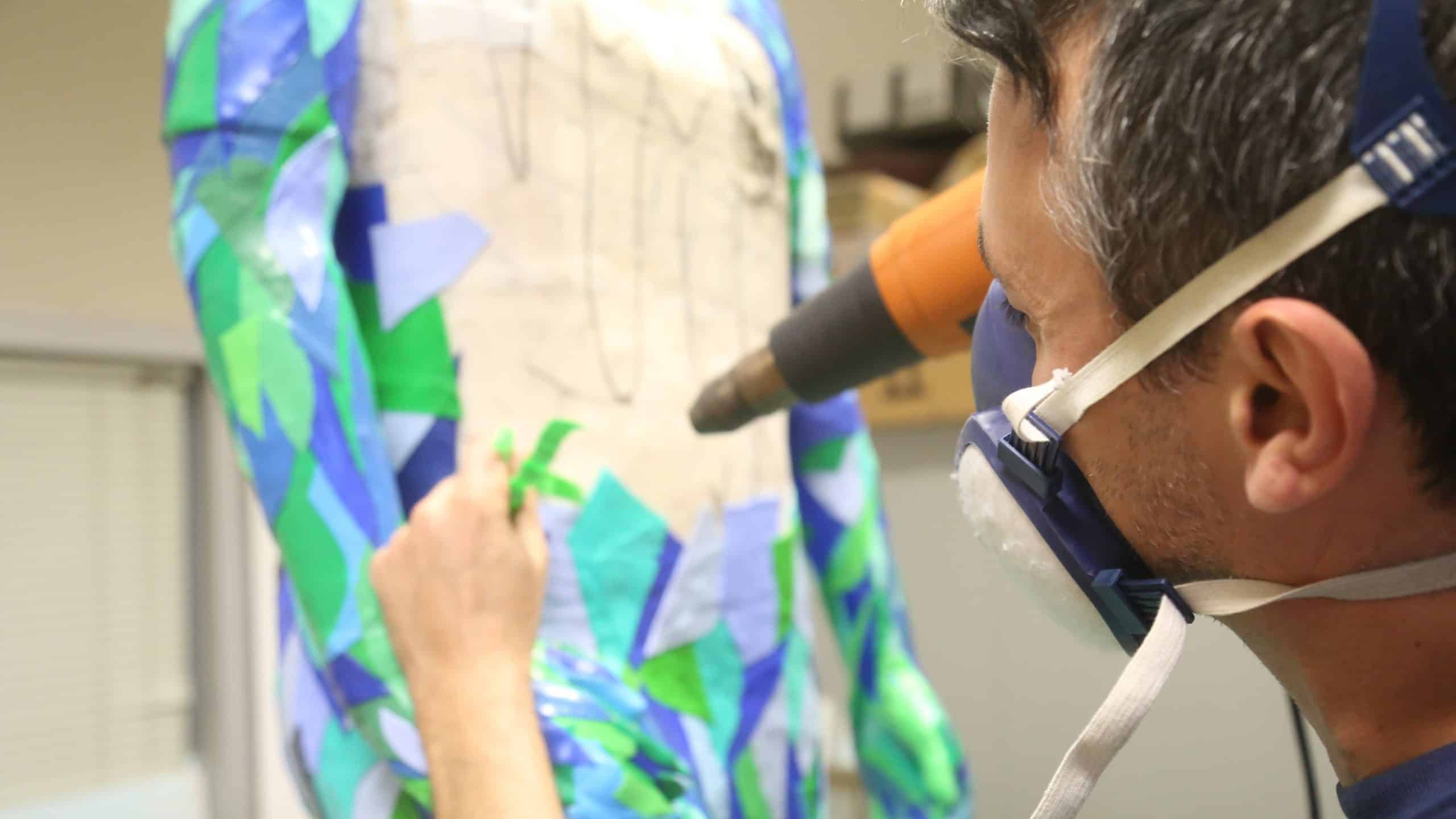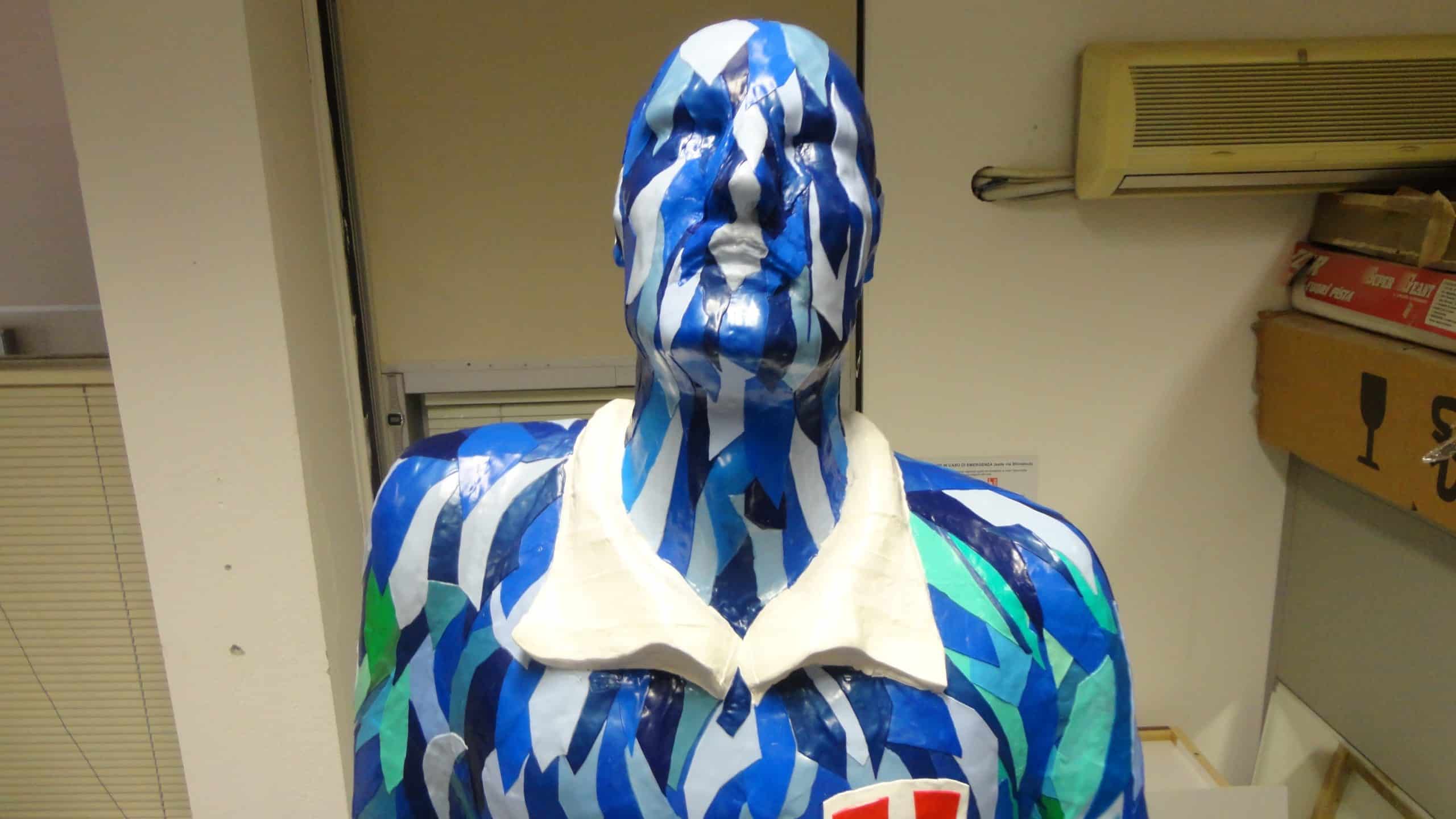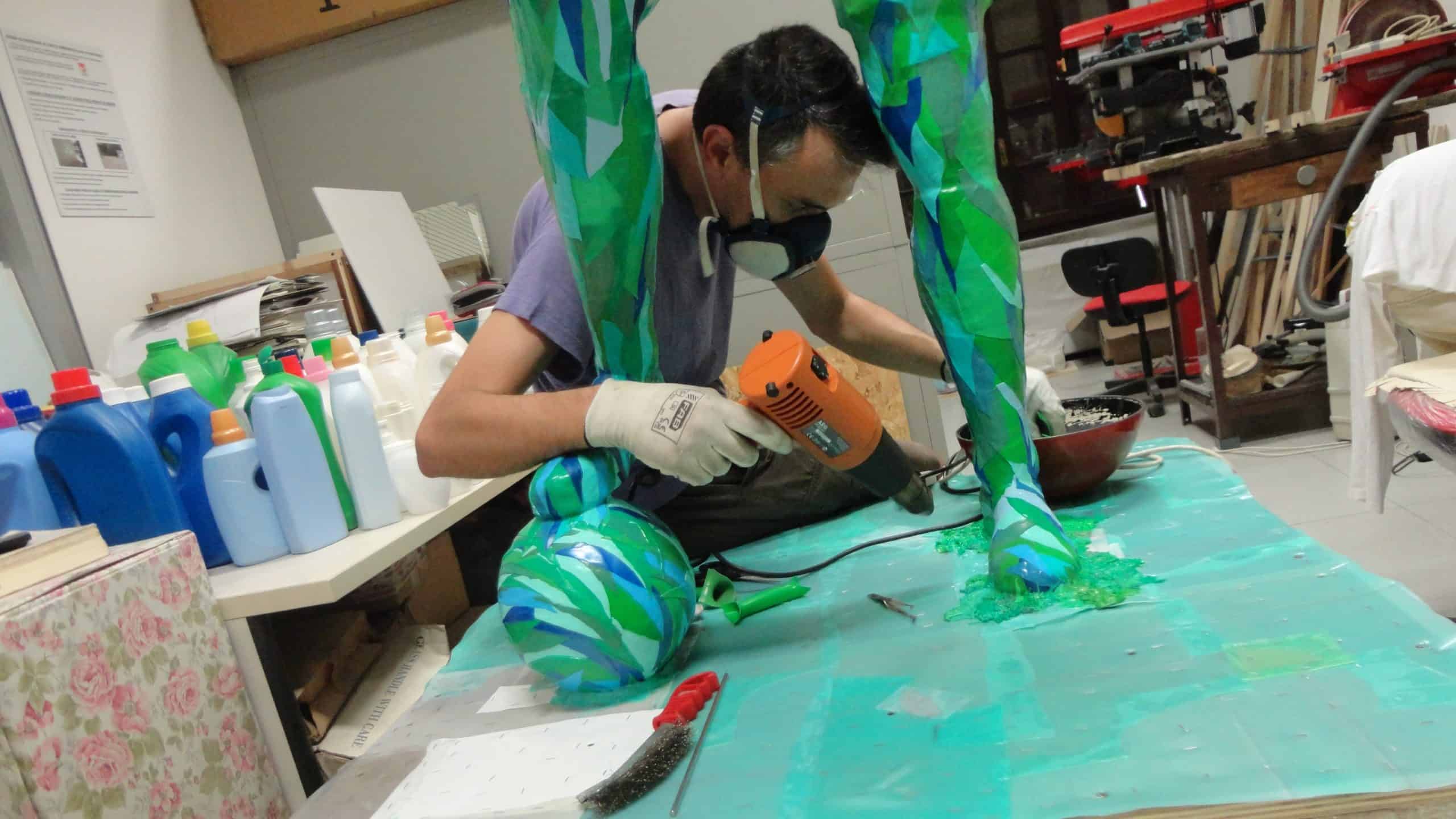 «Il basamento è rivestito da piastrelle di legno trattate con la resina, mentre la statua è alta 1 metro e 86, la sua reale statura, ed è composta da un’anima di legno recuperato ricoperta da plastica fusa derivante da circa 200 bottiglie colorate, per lo più detersivi – spiega l’artista – Alla base di questa tecnica di fusione c’è l’idea di dare una seconda vita a cose che normalmente butteremmo via; come le bottiglie di shampoo e di detersivo, che hanno di per sé dei colori bellissimi. In questo caso ho usato il verde e il blu: i colori del campo da gioco e del cielo, a cui il soggetto ritratto si rivolge, oltre che del Novara Calcio».