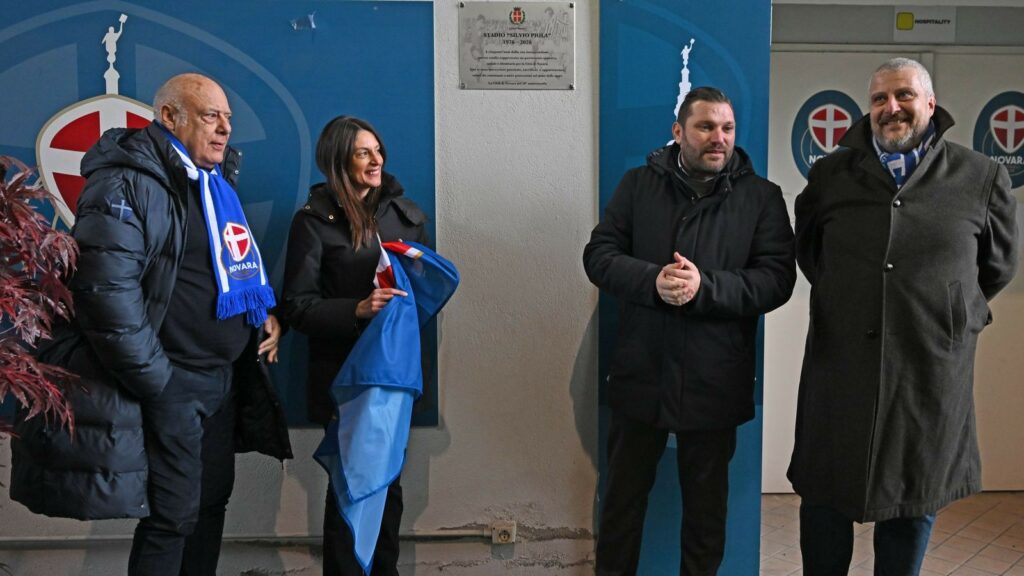 Prima del fischio d’inizio della sfida tra Novara e Pro Patria, la società biancazzurra ha scoperto la targa commemorativa per i 50 anni dello stadio “Silvio Piola”. L’impianto novarese fu infatti inaugurato il 22 gennaio 1976, in un amichevole contro la Juventus. Presente per la società il vice presidente Massimo Accornero (in foto, ultimo a destra, con a fianco l’assessore allo sport Ivan De Grandis).